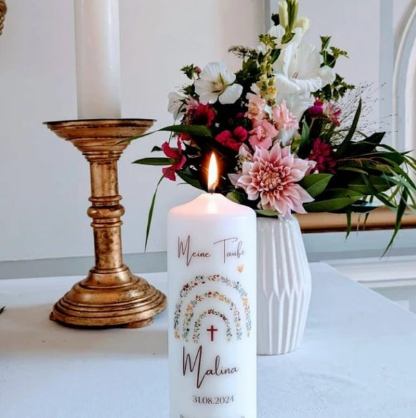 Der Regenbogen auf einer Taufkerze symbolisiert Gottes Versprechen und die Hoffnung. Er steht für den Bund und die Zusicherung, dass Gott immer bei uns ist, und erinnert an die Schönheit und die Vielfalt des Lebens, die durch die Taufe gesegnet wird.