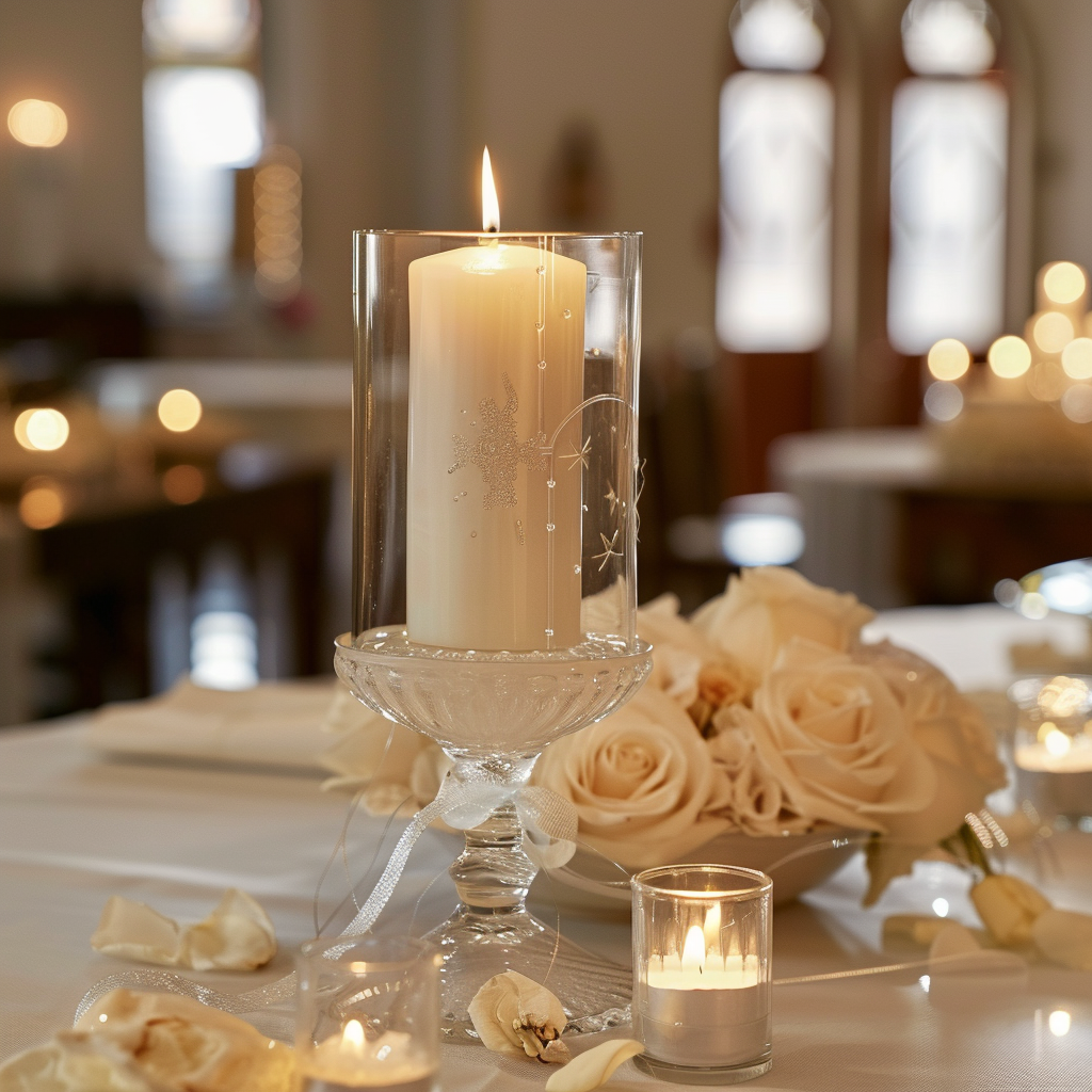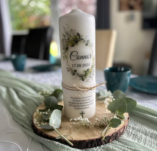 - Taufkerze: Stellen Sie die Taufkerze auf einen eleganten Kerzenhalter in die Mitte des Tisches oder auf einen dekorativen Tischaufsatz. Achten Sie darauf, dass sie sicher steht und gut sichtbar ist.