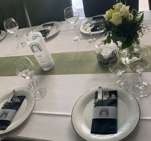- Blumengestecke: Platzieren Sie ein zartes Blumengesteck in der Mitte des Tisches. Wählen Sie Blumen in den Farben der Taufkerze oder in neutralen Tönen, um die Festlichkeit zu betonen. Weiße Rosen, Pfingstrosen oder Lilien sind besonders elegant und passen gut zu einer Taufe.