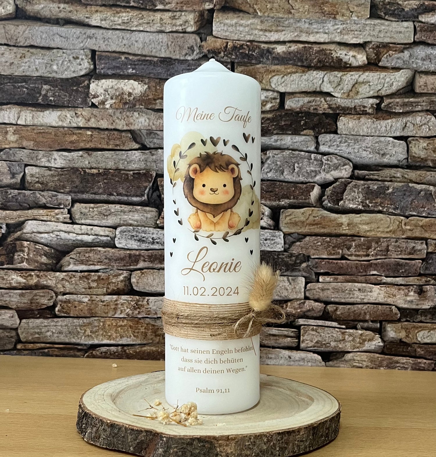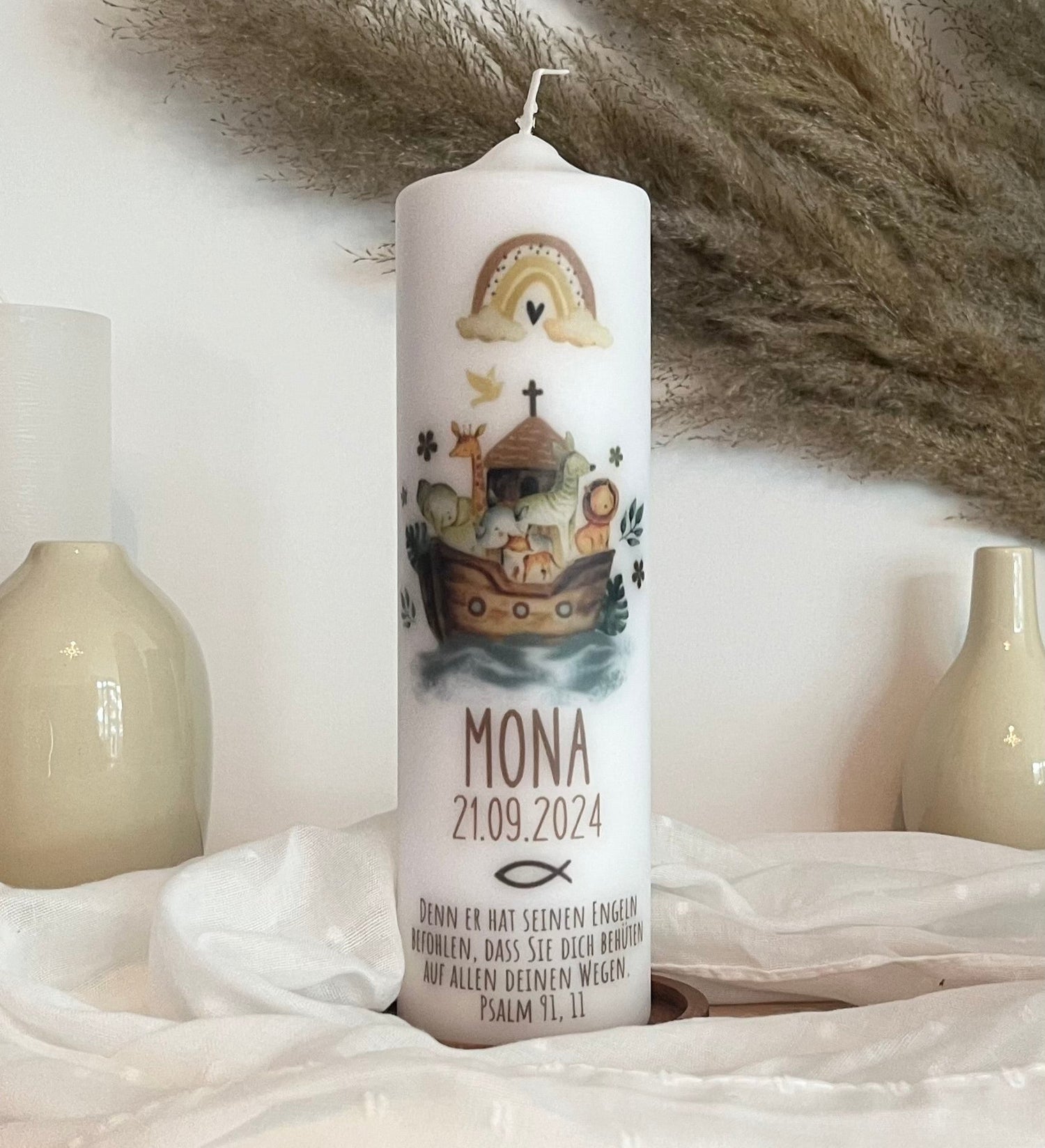 In unserem Shop bieten wir eine liebevolle Auswahl an Taufkerzen, die sorgfältig gestaltet sind, um den besonderen Moment der Taufe zu feiern. Unsere Kerzen zeigen oft farbenfrohe Regenbögen oder die biblische Noahs Arche, die Hoffnung und Neuanfang symbolisieren. Tiersymbole, die in freundlichen und fröhlichen Designs dargestellt sind, erinnern an die Schöpfung und die Vielfalt des Lebens, während Blumenmotive für Wachstum und die Blüte des neuen Lebens stehen. Kleine, aber bedeutungsvolle Symbole wie das Kreuz, die Taube und der Fisch ergänzen das Design und bringen die spirituelle Tiefe der Taufe zum Ausdruck. Jede Kerze ist so gestaltet, dass sie die Feierlichkeit und den Segen der Taufe auf eine besondere Weise widerspiegelt und zu einem wertvollen Erinnerungsstück für das Kind wird.