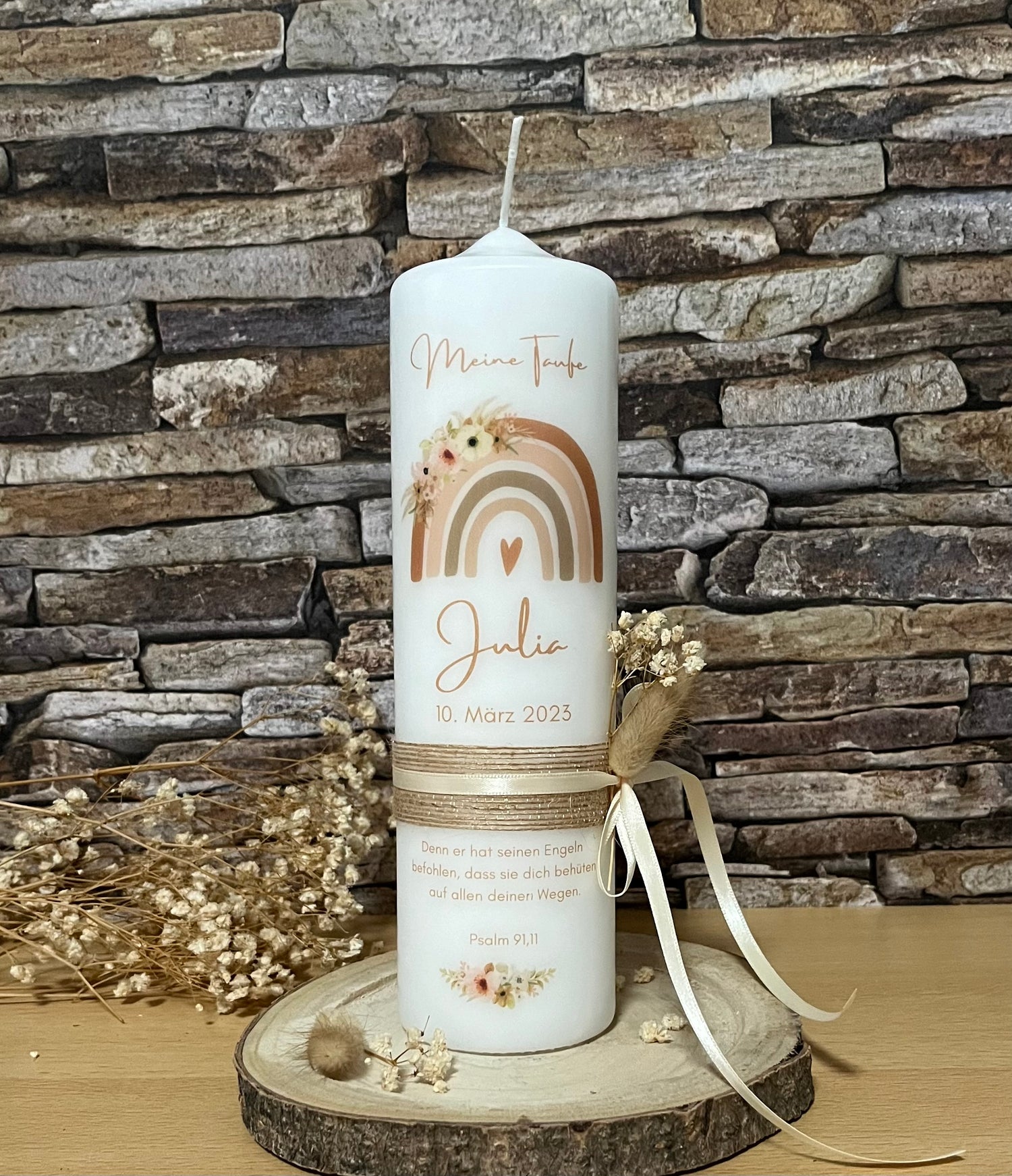 Der Regenbogen auf einer Taufkerze symbolisiert Gottes Versprechen und die Hoffnung. Er steht für den Bund und die Zusicherung, dass Gott immer bei uns ist, und erinnert an die Schönheit und die Vielfalt des Lebens, die durch die Taufe gesegnet wird.