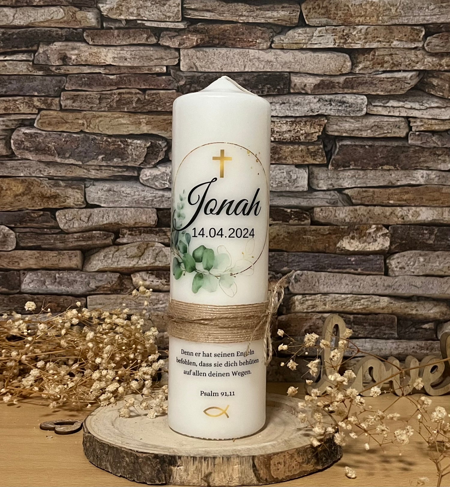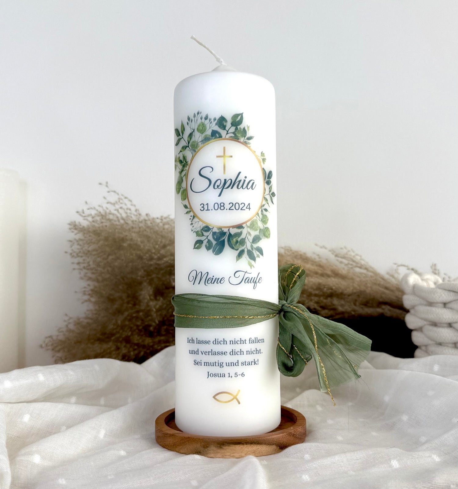 Die Taufkerze ist ein besonderes Symbol der Taufe und sollte daher den Namen des Täuflings, das Datum der Taufe und einen Taufspruch tragen. Der Name des Kindes macht die Kerze persönlich und individuell, was den einzigartigen Moment der Taufe unterstreicht. Das Datum markiert den besonderen Tag und erinnert an diesen wichtigen Anlass. Der Taufspruch, oft ein Segensvers aus der Bibel, bietet dem Kind spirituelle Begleitung und Ermutigung auf seinem Lebensweg. Gemeinsam verleihen diese Elemente der Taufkerze eine tiefe Bedeutung und machen sie zu einem wertvollen Andenken an diesen feierlichen Tag.