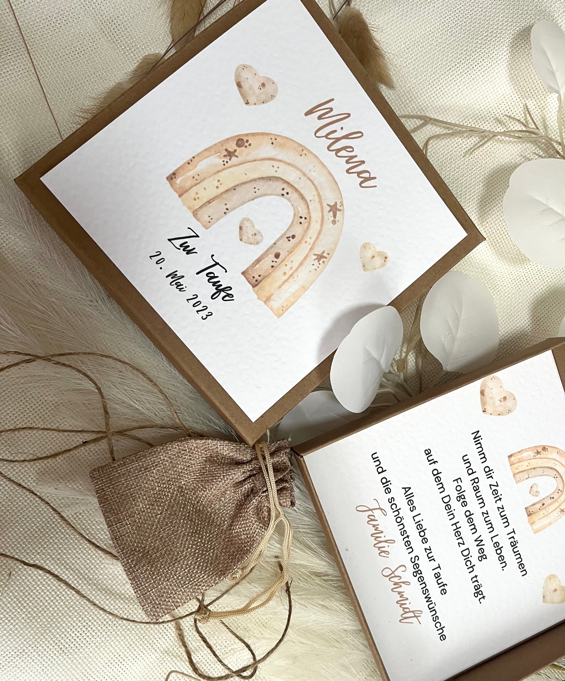Mit dieser personalisierten Geschenkschachtel erhaltet ihr ein individuelles und wunderschönes Geldgeschenk zur Taufe.