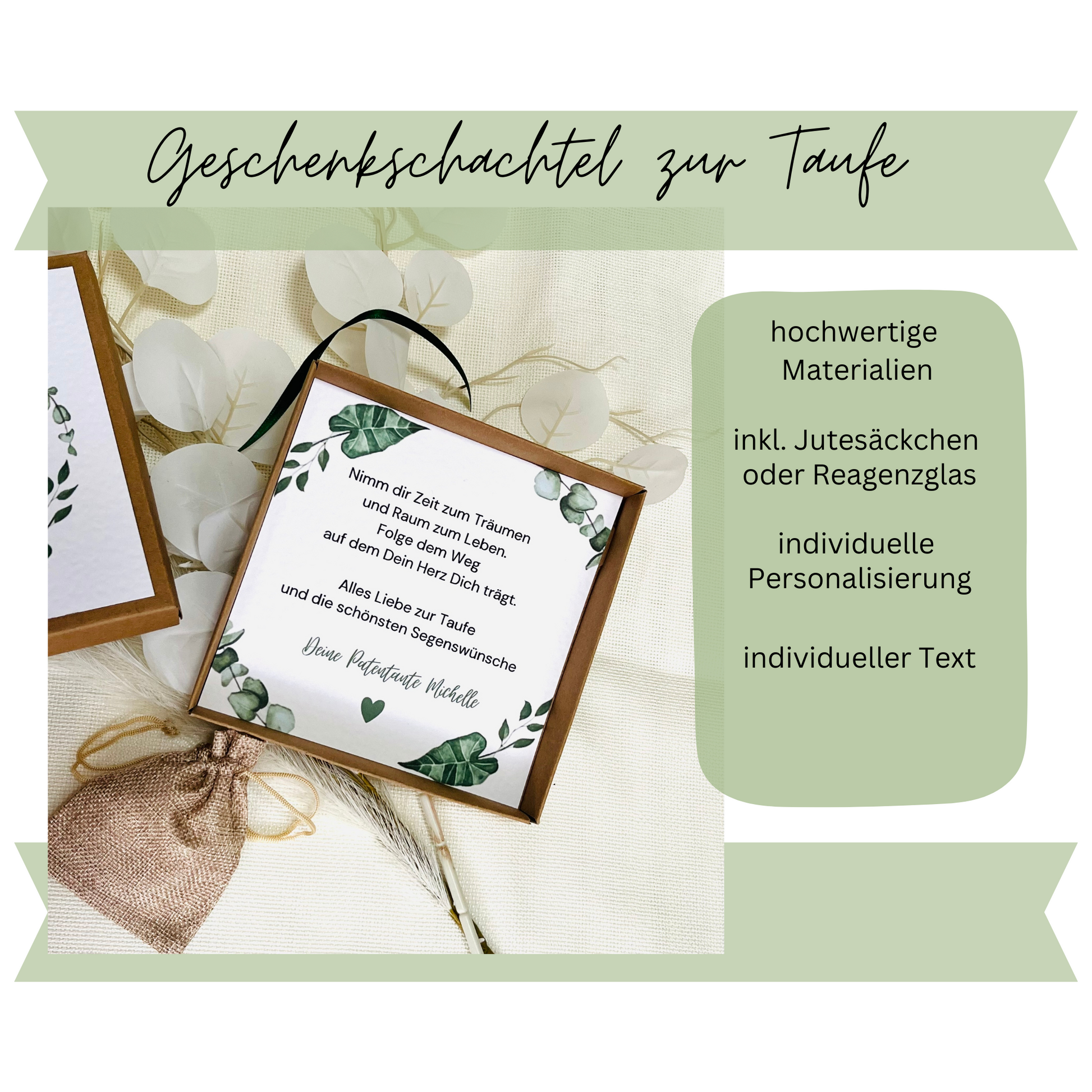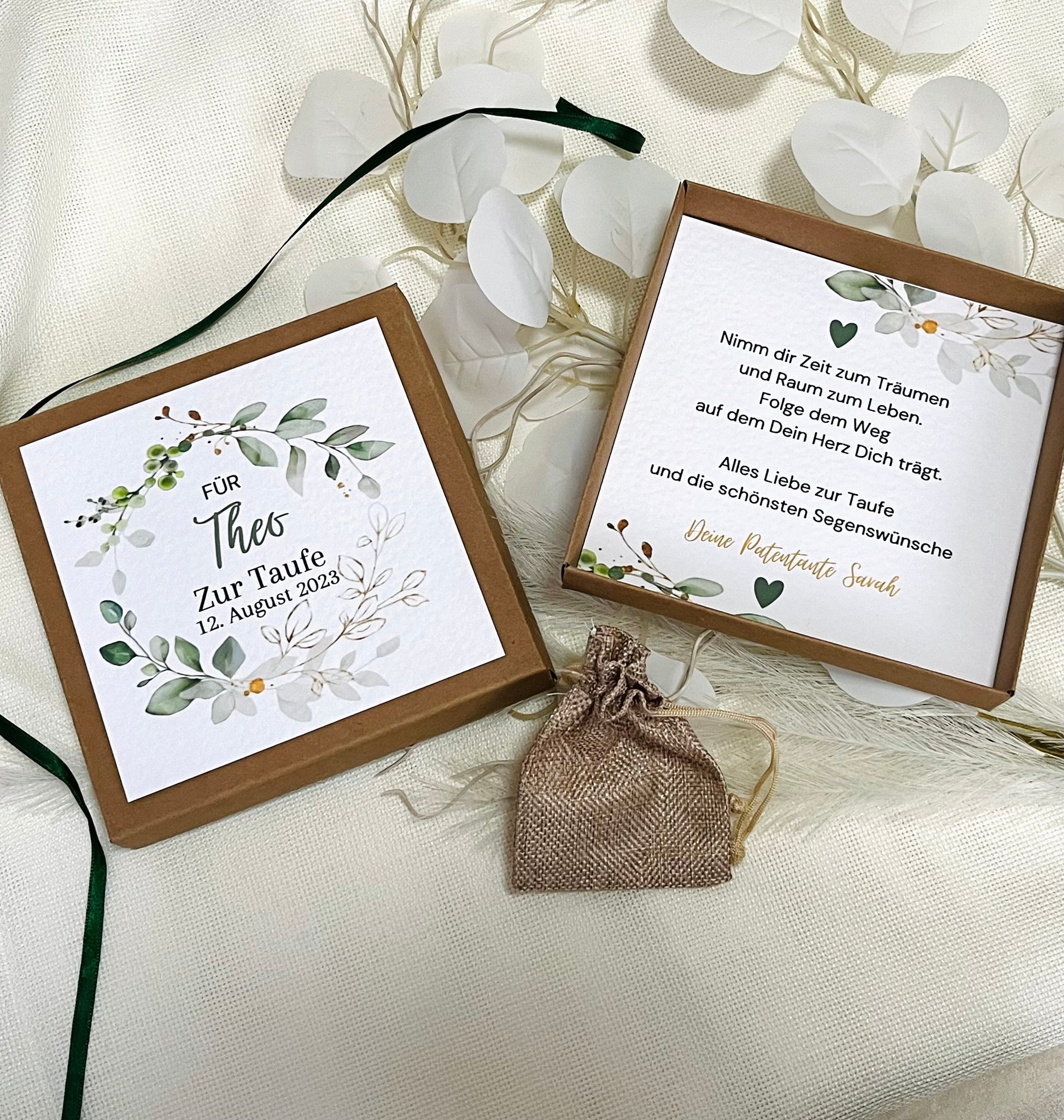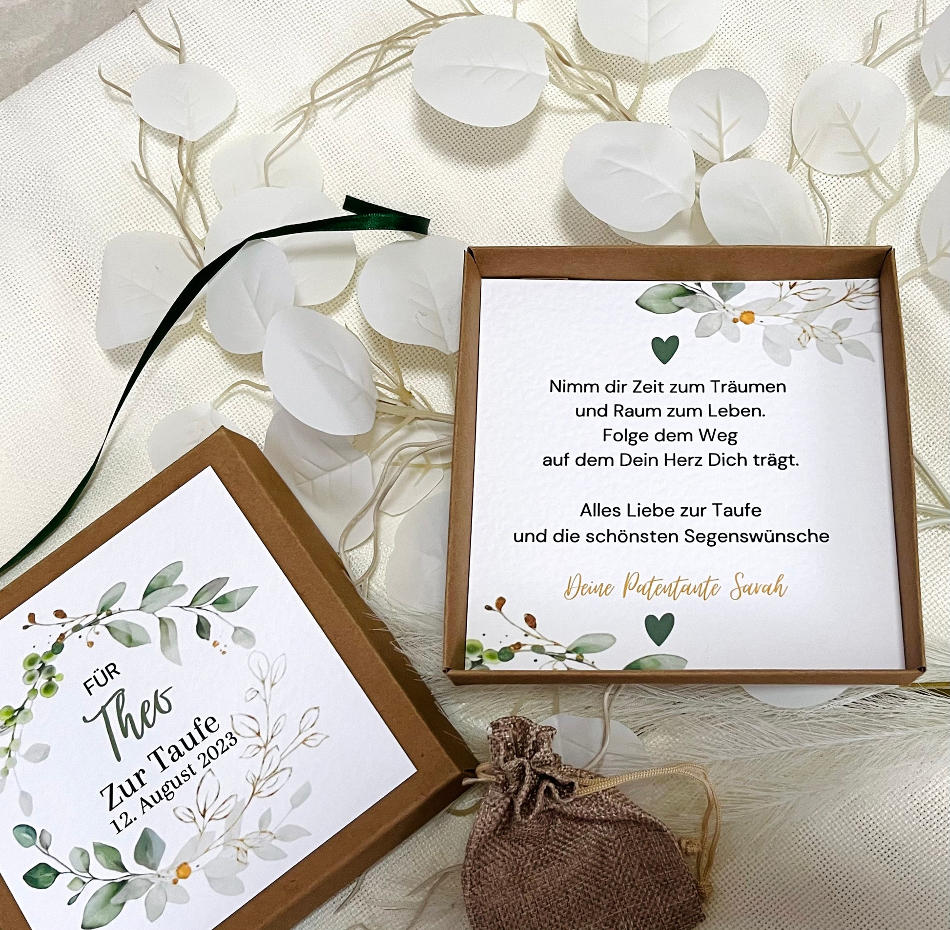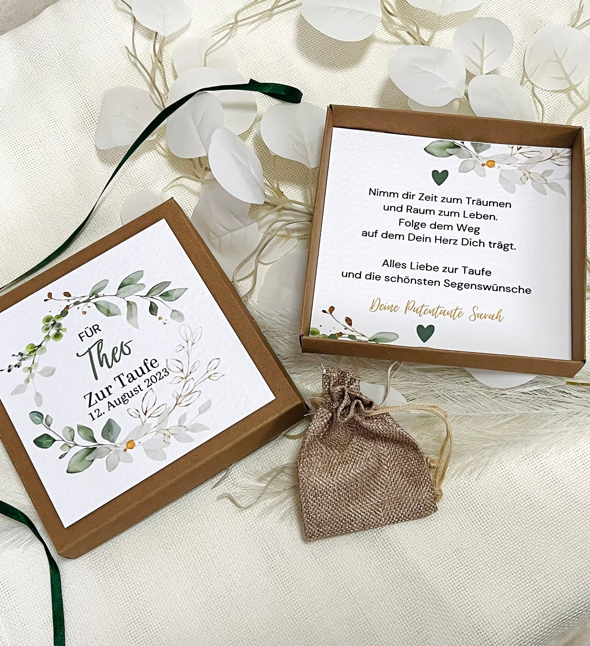 In dem kleinen Jutesäckchen, könnt Ihr Euer Geldgeschenk, einen Gutschein oder eine Kleinigkeit zum Taufe verstauen und legt es einfach in die Geschenkbox.