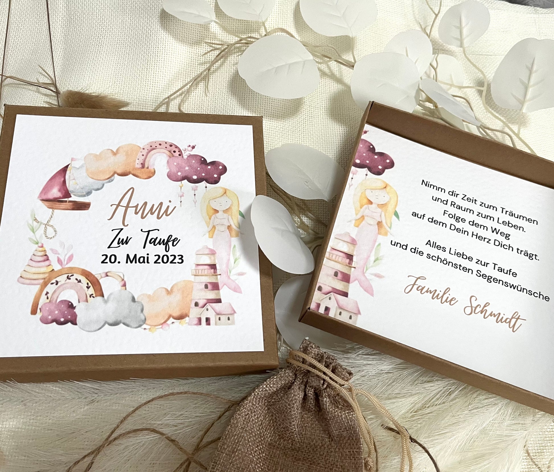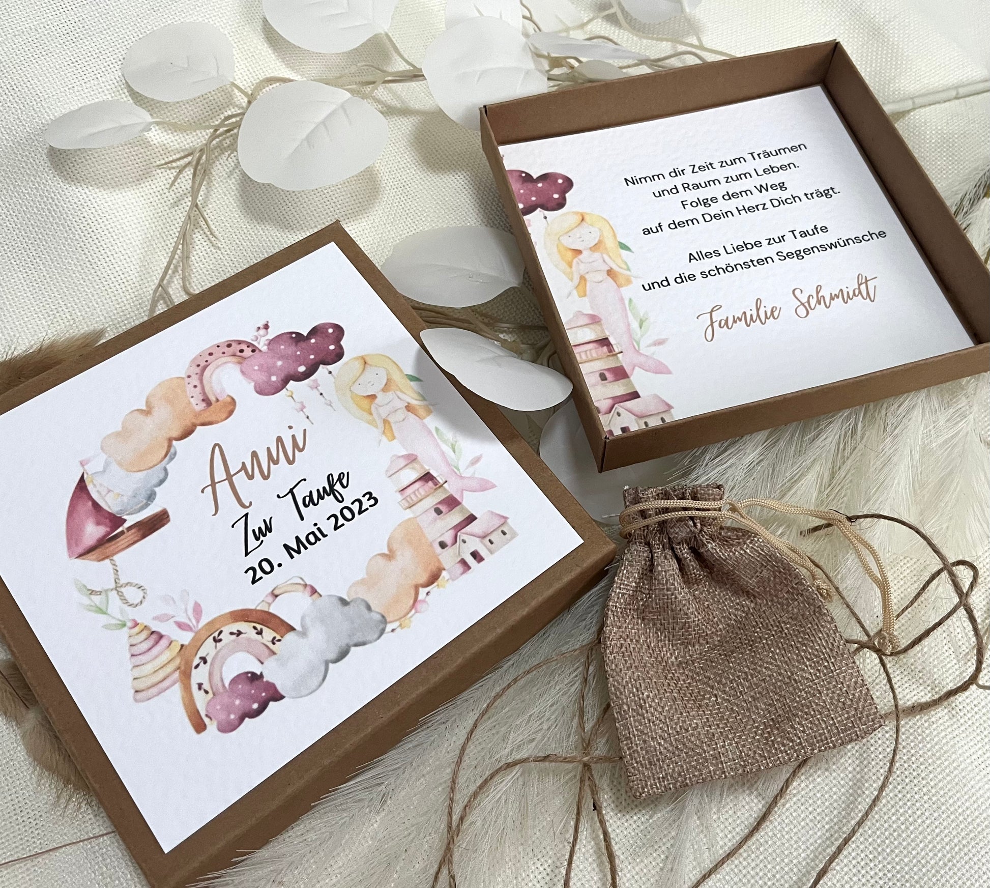 Mit dieser personalisierten Geschenkschachtel erhaltet ihr ein individuelles und wunderschönes Geldgeschenk zur Taufe.