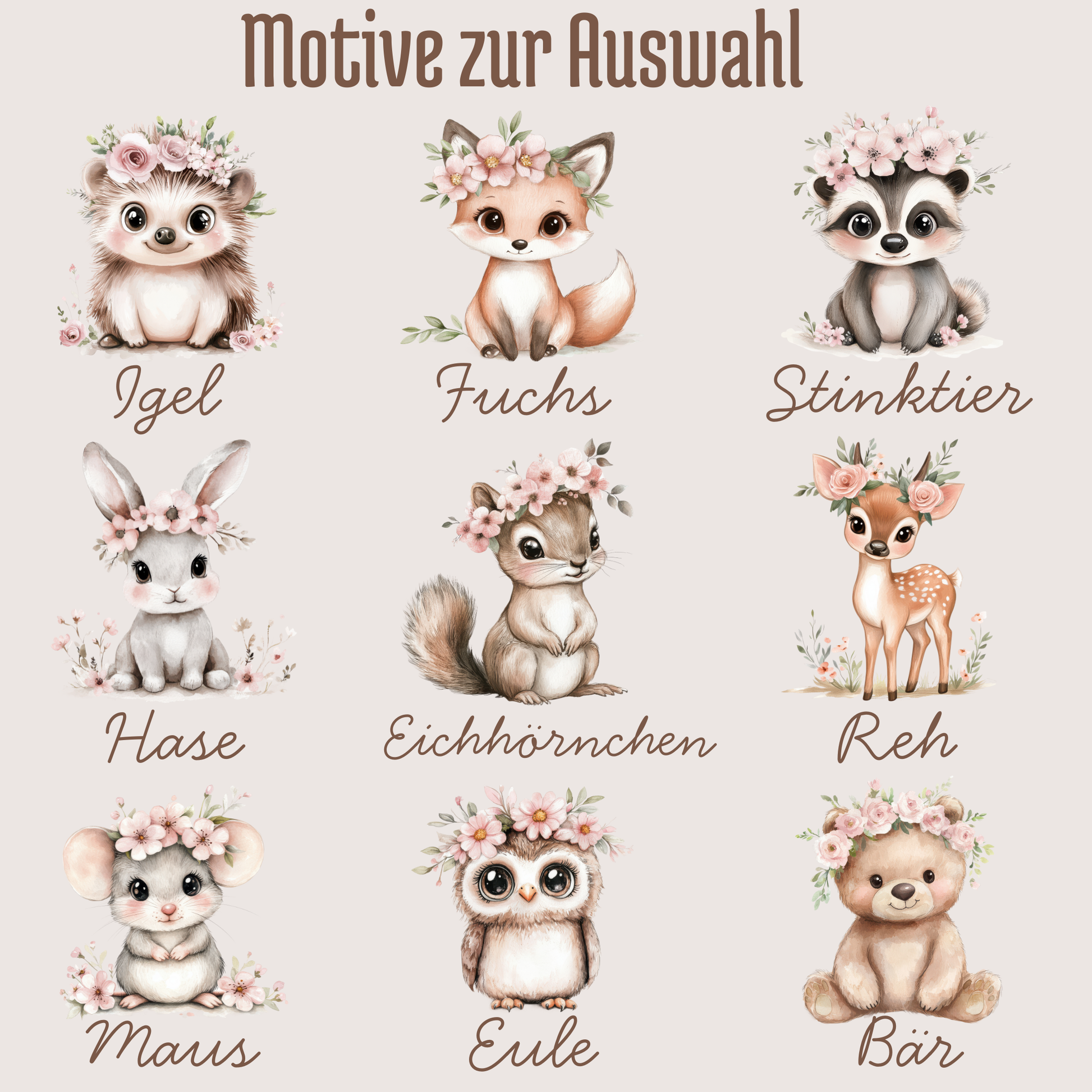 Alle Produkte sind im gleichen Stil gestaltet – wahlweise Waldtiere (Fuchs, Reh, Eule, Bär, Eichhörnchen, Igel) oder Safaritiere (Elefant, Löwe, Giraffe, Zebra, Affe) – und werden individuell mit dem Namen des Kindes personalisiert.