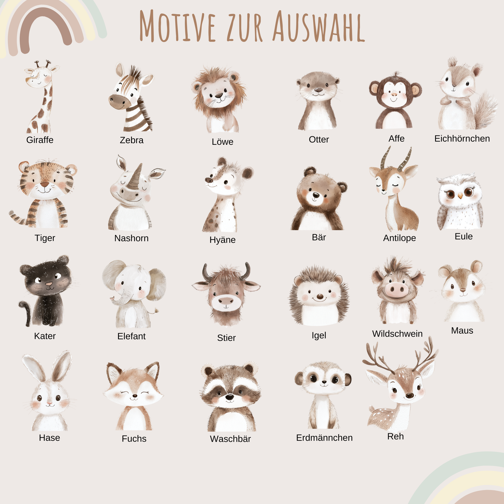 Zur Auswahl stehen viele liebevoll illustrierte Tiermotive: