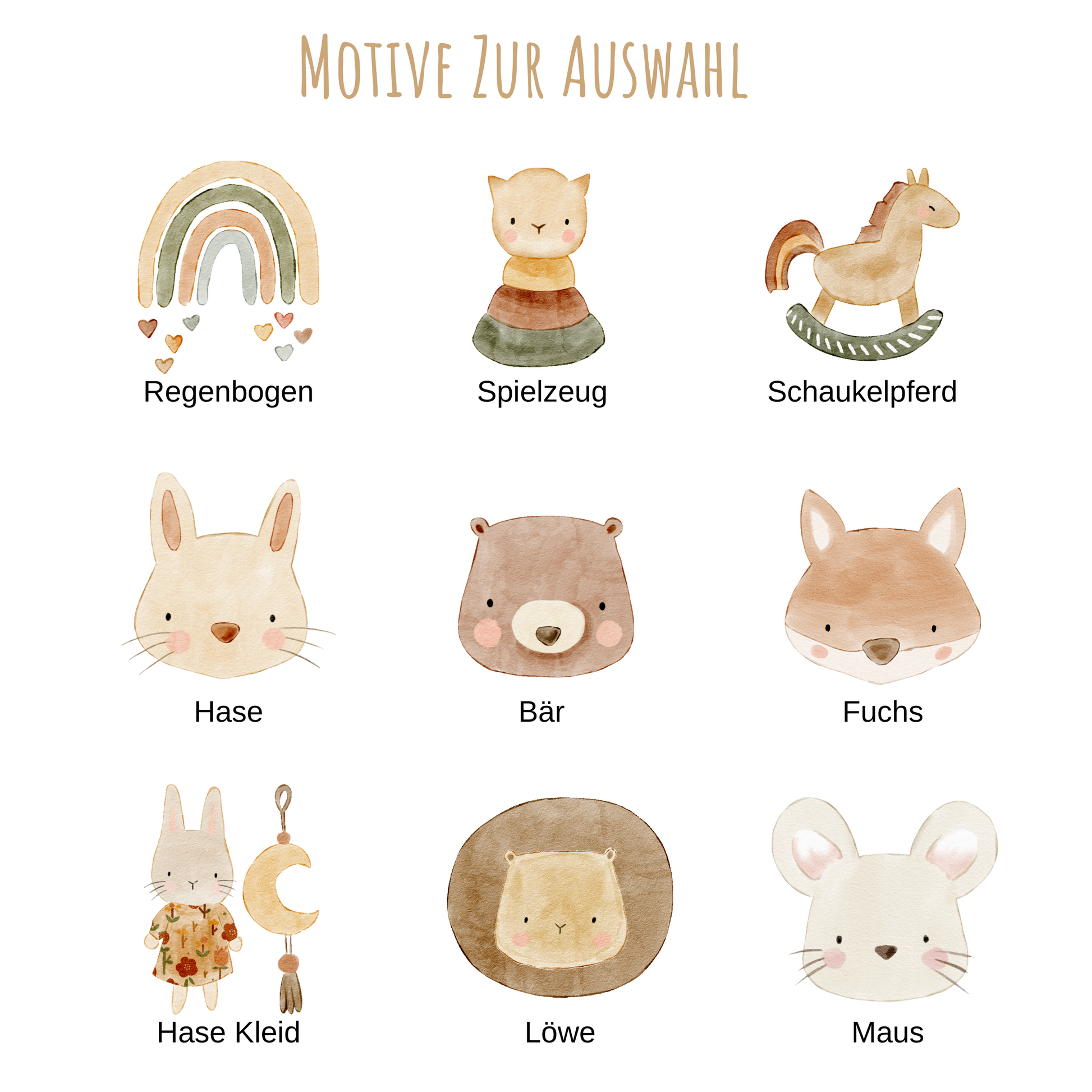 Wähle dein Wunschmotiv aus unserer exklusiven Tierkollektion – alle liebevoll illustriert im zarten Aquarellstil:
